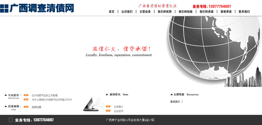 广西清债网是由一支十几年从事清债讨债、私家侦探、私人保镖、冲突危机处理具有职业经验的团队共同发起建立的服务平台。我们关系网络渗透各个领域,曾经执行过无数的委托任务...